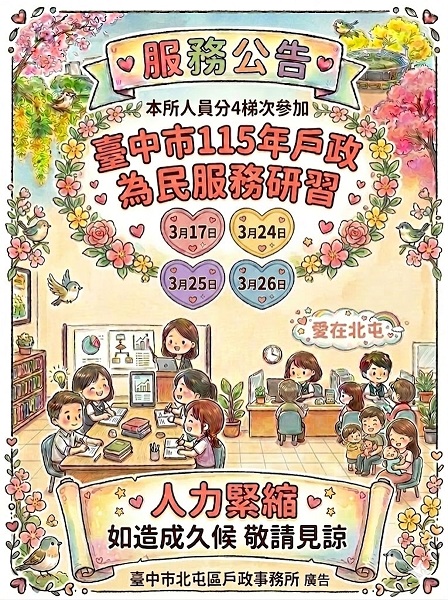 臺中市115年戶政為民服務研習期間,本所現場服務人力緊縮,如造成久候不便,敬請見諒